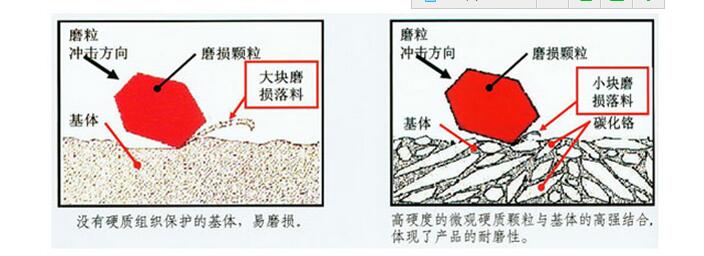 碳化鉻耐磨鋼板中含有大量的Cr7C3硬質(zhì)相,這些硬質(zhì)相是碳化鉻耐磨鋼板耐磨的主要原因,那么為什么Cr7C3能提高耐磨性?這是因?yàn)镃r7C3具有較高的硬度,在磨損時(shí)會(huì)發(fā)生如下圖的作用.
